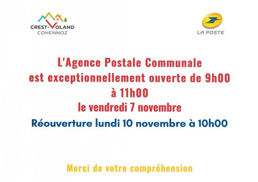 Ci-joint une information concernant les horaires d'ouverture exceptionnelles de l'agence postale le 7 novembre 2025.