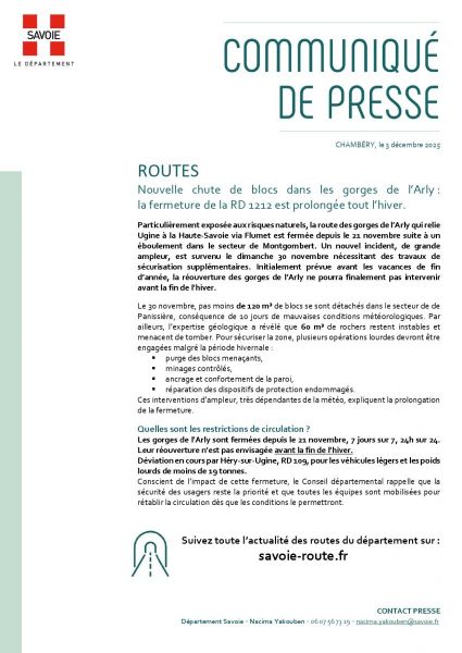 Veuillez trouver ci-joint un communiqué de presse du département concernant la route des Gorges de l'Arly.